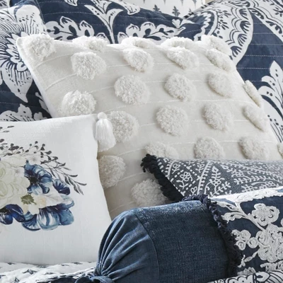 The Pom Pom decorative pillow matches perfectly with the Levtex Home Abelia bedding collection. This pillow is sized at 18 x 18in. and features pom poms and tufting in a linear format in white. The color palette makes this a versatile accessory for your bed, couch or favorite chair. The pilow comes pre-filled with a soft. luxurious feather inner.
