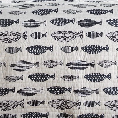 The Bakio Reversible Quilt Set by Levtex Home is inspired by a laid back coastal escape. Offered in shades of navy and white, this design will immediately transform your bedroom. Made with the softest lightweight cotton, this reversible quilt features a woodblock pattern of fish in navy geometric desigsn on the front,, reversing to a navy and white mudcloth geometric on the other. Enjoy this for years to come!