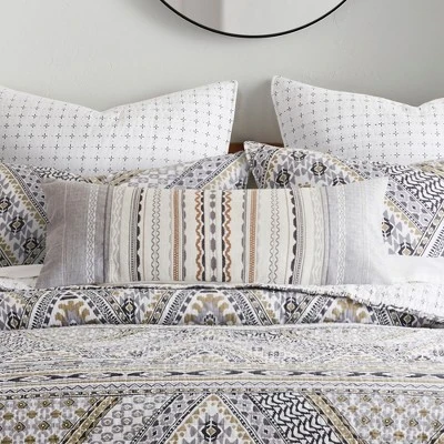 The Embroidered – Appliqued decorative pillow matches perfectly with the Levtex Home Etrada bedding collection. This pillow is sized at 14 x 32in. and features detailed stitching geometric design on a pieced natural and cream textured ground. The taupe, cream, brown and beige color palette makes this a versatile accessory for your bed, couch or favorite chair. The pillow comes pre-filled with a soft, luxurious feather inner.