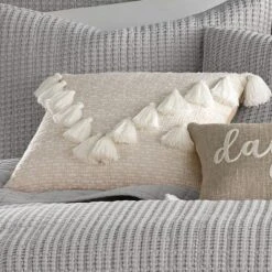 The Tassel Decorative Pillow by Levtex Home complements the Mills Waffle Collection. It is extremely versatile and can be used to accessorize your bed, add a level of interest to your living room or use on your favorite chair. The Tassel pillow is made from a luxurious woven, textured fabric in cream tones and features a necklace of cream tassels in a V pattern across the body of the pillow. It is 14 x 18 in. and comes filled with a hypollergenic polyester inner. Enjoy it for years to come!”